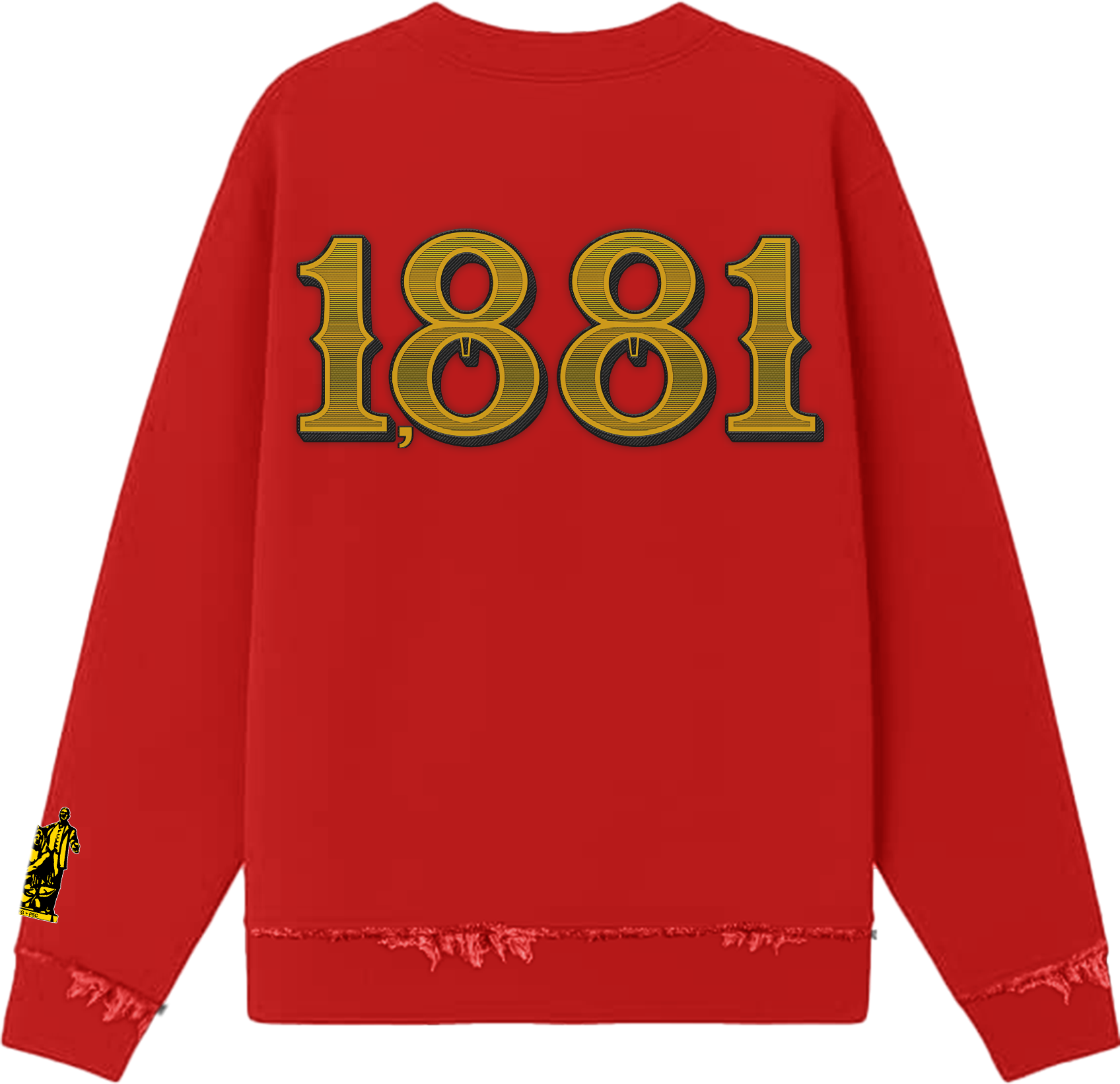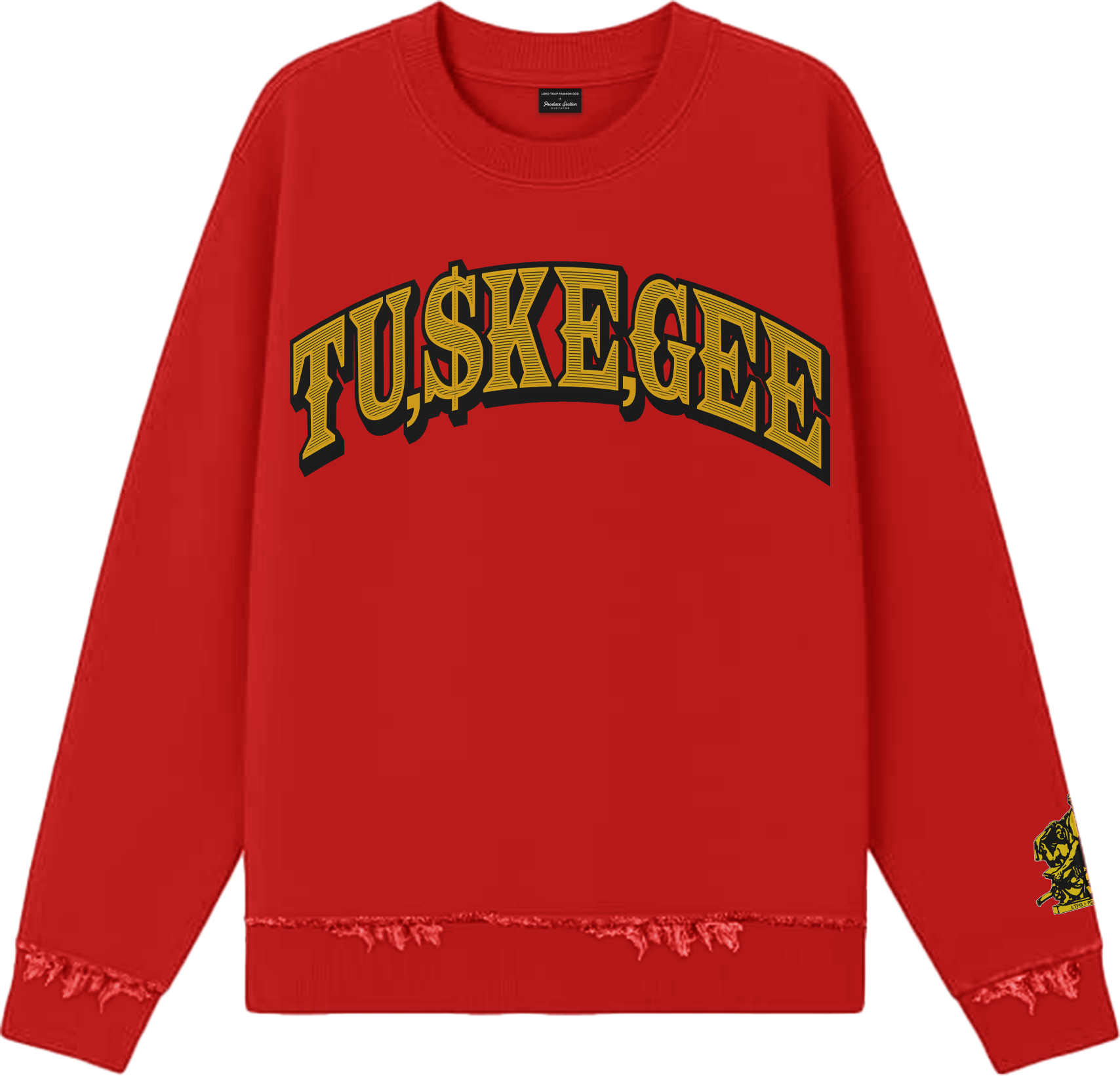 Featuring a bold, arched “TU,$KE,GEE” embroidery across the chest and the founding year “1,881” on the back in large varsity-style gold lettering, this heavyweight fleece delivers vintage energy with modern luxury. The raw distressed hem adds streetwear edge, while the left wrist is marked with a powerful embroidered image of the "Lifting the Veil of Ignorance" statue, a visual symbol of TU’s ongoing mission.